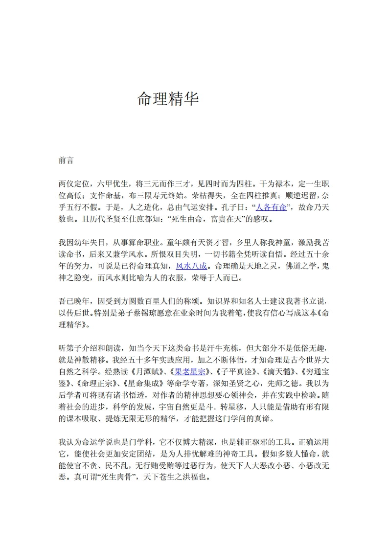 命理精华前言两仪定位,六甲优生,将三元而作三才,见四时而为四柱。干为禄本,定一生职位高低:支作命基,布三限寿元终始。荣枯得失,全在四柱推真:顺逆迟留,奈乎五行不假。于是,人之造化,总由气运安排。孔子日:“人各有命”,故命乃天数也。且历代圣贤至仕庶都知:“死生由命,富贵在天”的感叹。我因幼年失目,从事算命职业。童年颇有天资才智,乡里人称我神童,激励我苦读命书,后来又兼学风水。所恨双目失明,一切书籍全凭听读自悟。经过五十余年的努力,可说是已得命理真知,风水八成。命理确是天地之灵,佛道之学,鬼神之隐变,而风水则比喻为人的衣服,荣辱于人而已。吾已晚年,因受到方圆数百里人们的称颂。知识界和知名人士建议我著书立说,以传后世。特别是弟子蔡锡琼愿意在业余时间为我着笔,使我有信心写成这本《命理精华》。听第子介绍和朗读,知当今天下这类命书是汗牛充栋,但大部分不是低俗无趣,就是神散精移。我经五十多年实践应用,加之不断体悟,才知命理是古今世界大自然之科学。经熟读《月潭赋》、《果老星宗》、《子平真诠》、《滴天髓》、《穷通宝鉴》、《命理正宗》、《星命集成》等命学专著,深知圣贤之心,先师之德。我以为后学者可将现有诸书悟透,对作者的精神思想要心领神会,并在实践中检验。随着社会的进步,科学的发展,宇宙自然更是斗.转星移,人只能是借助有形有限的课本吸取、提炼无限无形的精华,才能把握这门学问的真谛。我认为命运学说也是门学科,它不仅博大精深,也是辅正驱邪的工具。正确运用它,能使社会更加安定团结,是为人排忧解难的神奇工具。假如多数人懂命,就能使官不贪、民不乱,无行贿受贿等过恶行为,使天下人大恶改小恶、小恶改无恶。真可谓“死生肉骨”,天下苍生之洪福也。