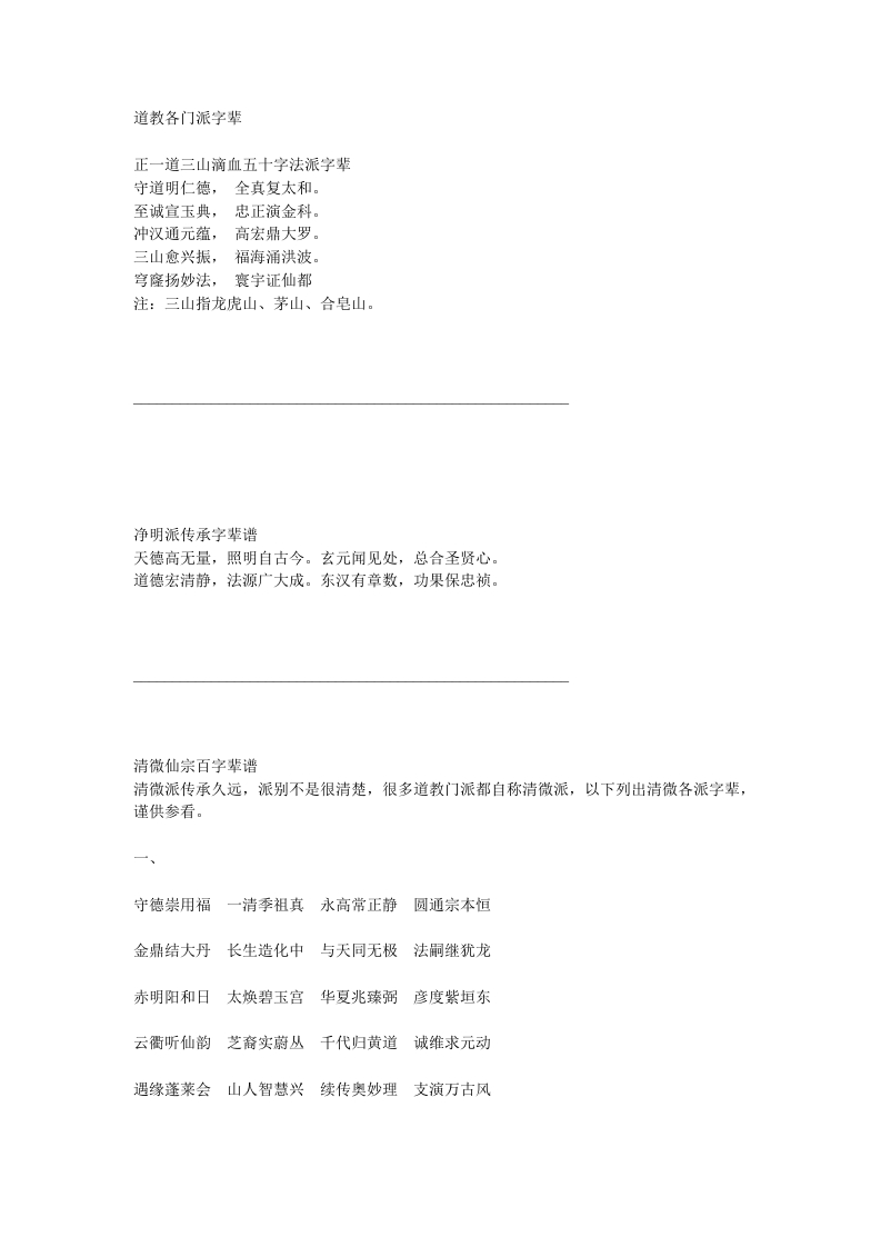 道教各门派字辈正一道三山滴血五十字法派字辈守道明仁德,全真复太和。至诚宣玉典,忠正演金科。冲汉通元蕴,高宏鼎大罗。三山愈兴振,福海涌洪波。穹窿扬妙法,寰宇证仙都注:三山指龙虎山、茅山、合皂山。净明派传承字辈谱天德高无量,照明自古今。玄元闻见处,总合圣贤心。道德宏清静,法源广大成。东汉有章数,功果保忠祯。清微仙宗百字辈谱清微派传承久远,派别不是很清楚,很多道教门派都自称清微派,以下列出清微各派字辈,谨供参看。一、守德崇用福一清季祖真永高常正静圆通宗本恒金鼎结大丹长生造化中与天同无极法嗣继犹龙赤明阳和日太焕碧玉宫华夏兆臻弼彦度紫垣东云衢听仙韵芝裔实蔚丛千代归黄道诚维求元动遇缘蓬莱会山人智慧兴续传奥妙理支演万古风