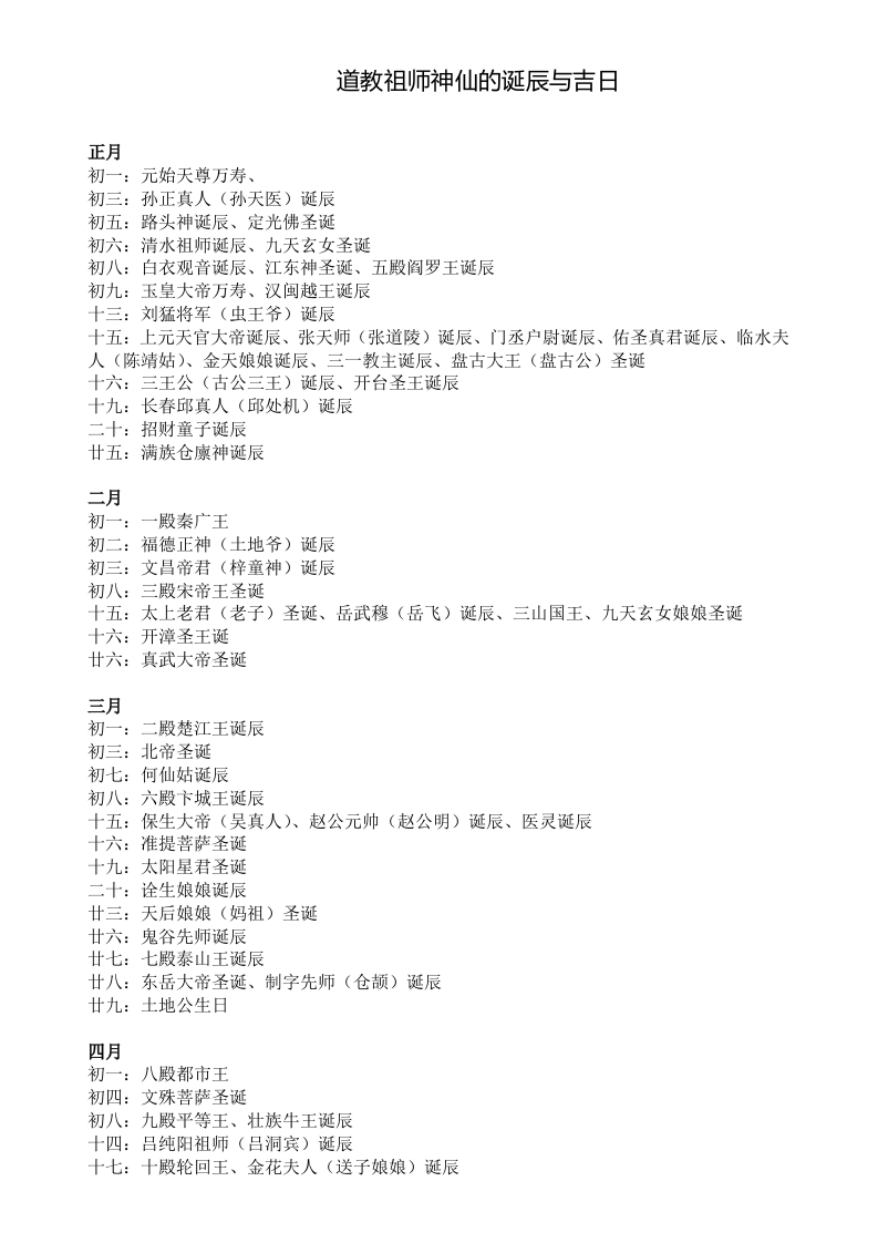 道教祖师神仙的诞辰与吉日正月初一:元始天尊万寿、初三:孙正真人(孙天医)诞辰初五:路头神诞辰、定光佛圣诞初六:清水祖师诞辰、九天玄女圣诞初八:白衣观音诞辰、江东神圣诞、五殿阎罗王诞辰初九:玉皇大帝万寿、汉闽越王诞辰十三:刘猛将军(虫王爷)诞辰十五:上元天官大帝诞辰、张天师(张道陵)诞辰、门丞户尉诞辰、佑圣真君诞辰、临水夫人(陈靖姑)、金天娘娘诞辰、三一教主诞辰、盘古大王(盘古公)圣诞十六:三王公(古公三王)诞辰、开台圣王诞辰十九:长春邱真人(邱处机)诞辰二十:招财童子诞辰廿五:满族仓廪神诞辰二月初一:一殿秦广王初二:福德正神(土地爷)诞辰初三:文昌帝君(梓童神)诞辰初八:三殿宋帝王圣诞十五:太上老君(老子)圣诞、岳武穆(岳飞)诞辰、三山国王、九天玄女娘娘圣诞十六:开漳圣王诞廿六:真武大帝圣诞三月初一:二殿楚江王诞辰初三:北帝圣诞初七:何仙姑诞辰初八:六殿卞城王诞辰十五:保生大帝(吴真人)、赵公元帅(赵公明)诞辰、医灵诞辰十六:准提菩萨圣诞十九:太阳星君圣诞二十:诠生娘娘诞辰廿三:天后娘娘(妈祖)圣诞廿六:鬼谷先师诞辰廿七:七殿泰山王诞辰廿八:东岳大帝圣诞、制字先师(仓颉)诞辰廿九:土地公生日四月初一:八殿都市王初四:文殊菩萨圣诞初八:九殿平等王、壮族牛王诞辰十四:吕纯阳祖师(吕洞宾)诞辰十七:十殿轮回王、金花夫人(送子娘娘)诞辰