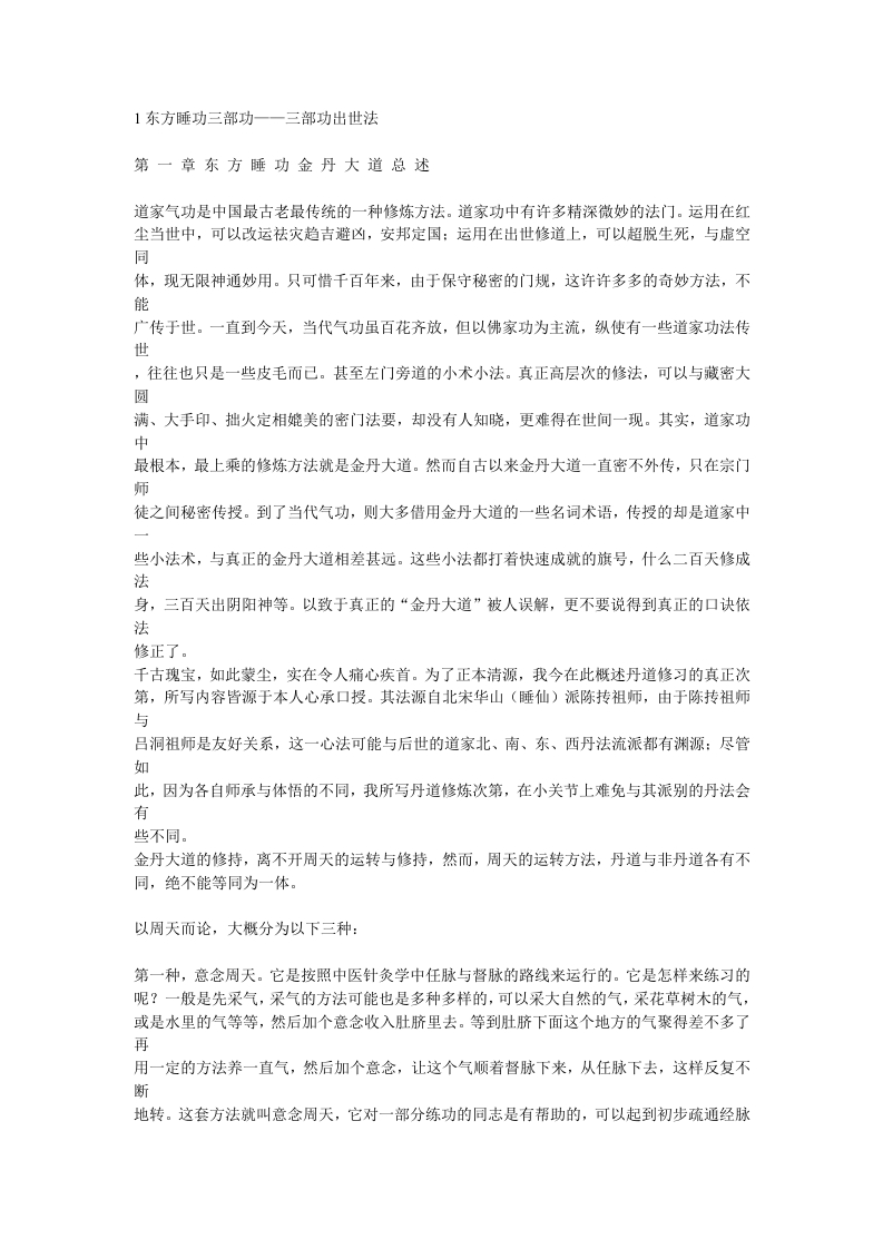 1东方睡功三部功一一三部功出世法第一章东方睡功金丹大道总述道家气功是中国最古老最传统的一种修炼方法。道家功中有许多精深微妙的法门。运用在红尘当世中,可以改运祛灾趋吉避凶,安邦定国:运用在出世修道上,可以超脱生死,与虚空同体,现无限神通妙用。只可惜千百年来,由于保守秘密的门规,这许许多多的奇妙方法,不能广传于世。一直到今天,当代气功虽百花齐放,但以佛家功为主流,纵使有一些道家功法传世,往往也只是一些皮毛而己。甚至左门旁道的小术小法。真正高层次的修法,可以与藏密大圆满、大手印、拙火定相嫜美的密门法要,却没有人知晓,更难得在世间一现。其实,道家功名最根本,最上乘的修炼方法就是金丹大道。然而自古以来金丹大道一直密不外传,只在宗门师徒之间秘密传授。到了当代气功,则大多借用金丹大道的一些名词术语,传授的却是道家中些小法术,与真正的金丹大道相差甚远。这些小法都打着快速成就的旗号,什么二百天修成法身,三百天出阴阳神等。以致于真正的“金丹大道”被人误解,更不要说得到真正的口诀依法修正了。千古瑰宝,如此蒙尘,实在令人痛心疾首。为了正本清源,我今在此概述丹道修习的真正次第,所写内容皆源于本人心承口授。其法源自北宋华山(睡仙)派陈抟祖师,由于陈抟祖师与吕洞祖师是友好关系,这一心法可能与后世的道家北、南、东、西丹法流派都有渊源:尽管如此,因为各自师承与体悟的不同,我所写丹道修炼次第,在小关节上难免与其派别的丹法会有些不同。金丹大道的修持,离不开周天的运转与修持,然而,周天的运转方法,丹道与非丹道各有不同,绝不能等同为一体。以周天而论,大概分为以下三种:第一种,意念周天。它是按照中医针灸学中任脉与督脉的路线来运行的。它是怎样来练习的呢?一般是先采气,采气的方法可能也是多种多样的,可以采大自然的气,采花草树木的气,或是水里的气等等,然后加个意念收入肚脐里去。等到肚脐下面这个地方的气聚得差不多了再用一定的方法养一直气,然后加个意念,让这个气顺着督脉下来,从任脉下去,这样反复不断地转。这套方法就叫意念周天,它对一部分练功的同志是有帮助的,可以起到初步疏通经脉