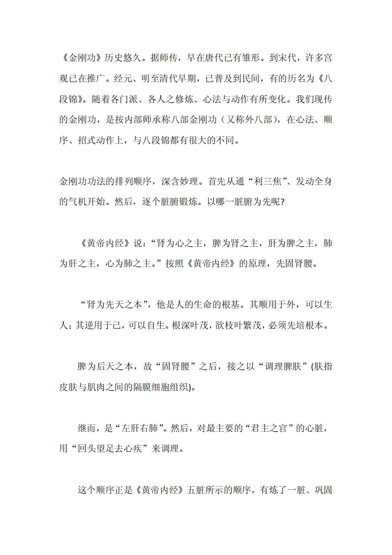 《金刚功》历史悠久。据师传,早在唐代已有雏形。到宋代,许多宫观已在推广。经元、明至清代早期,已普及到民间,有的历名为《八段锦》。随着各门派、各人之修炼、心法与动作有所变化。我们现传的金刚功,是按内部师承称八部金刚功(又称外八部),在心法、顺序、招式动作上,与八段锦都有很大的不同。金刚功功法的排列顺序,深含妙理。首先从通“利三焦”、发动全身的气机开始。然后,逐个脏腑锻炼。以哪一脏腑为先呢?《黄帝内经》说:“肾为心之主,脾为肾之主,肝为脾之主,肺为肝之主,心为肺之主。”按照《黄帝内经》的原理,先固肾腰。“肾为先天之本”,他是人的生命的根基。其顺用于外,可以生人;其逆用于己,可以自生。根深叶茂,欲枝叶繁茂,必须先培根本。脾为后天之本,故“固肾腰”之后,接之以“调理脾肤”(肤指皮肤与肌肉之间的隔膜细胞组织)。继而,是“左肝右肺”。然后,对最主要的“君主之官”的心脏,用“回头望足去心疾”来调理。这个顺序正是《黄帝内经》五脏所示的顺序,有炼了一脏、巩固