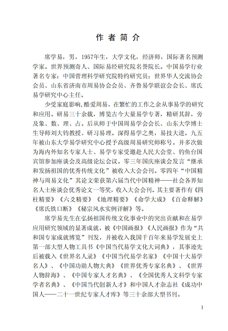 作者简介席学易,男,1957年生,大学文化,经济师,国际著名预测学家。世界预测奇人、国际易经研究院名誉院长。中国易学行业著名专家:中国营理科学研究院特约研究员:世界华人交流协会会员、山东省济南市周易协会会员、齐鲁易学联谊会会长、席氏易学研究中心主任。少受家庭影响,酷爱周易,在繁忙的工作之余从事易学的研究和应用。研易三十余载,博览古今大量易学专著,精研其辞,旁及象、数、理、占。后从师于中国周易学会会长、山东大学博士生导师刘大钧教授、研习易理。深得易学之奥,易技大进。九五年被山东大学易学研究中心授予高级周易研究师称号。并多次做为海内外知名专家人士、易学专家受邀赴人民大会堂、钓鱼台国宾馆参加座谈会及高级论坛会议。零三年国庆座谈会发言“继承和发扬祖国的优秀传统文化”被收入大会会刊。零四年“中国精神与周易文化”其论文荣获第六届当代中国精神一社会各界知名人士座谈会优秀论文一等奖,收入大会会刊。其主要著作有《四柱精要》《六爻精要》《地理精要》《命学大成》《百命释解》《席氏铁口断》《秘宗风水实例详解》等。席学易先生在弘扬祖国传统文化事业中的突出贡献和在易学应用研究领域的显著成就,被《中国画报》《人民画报》作为“共和国专家成就博览”刊发,并被收入我国千百年来易学发展史上第一部大型人物工具书《中国当代易学文化大词典》,其事迹先后被载入《世界名人录》《中国当代易学名家》《中国十大易学名人》、《中国功勋人物大典》《世界优秀专家名典》、《世界人物辞海》、《中国专家人才名典》、《全国优秀人文科学专家学者名典》、《中国当代创新人才》和中国人才杂志社《成功中国人一二十一世纪专家人才库》等三十余部大型书刊。1