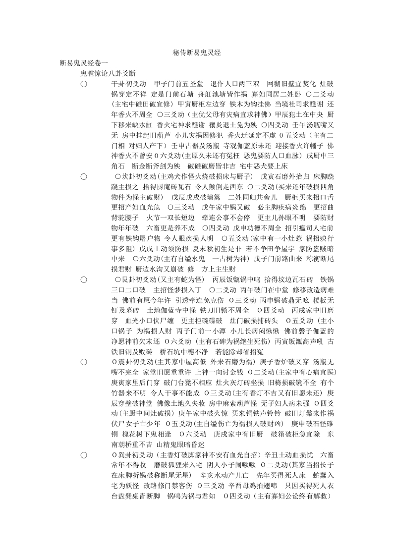 秘传断易鬼灵经断易鬼灵经卷一鬼瞻惊论八卦爻断O干卦初爻动甲子门前五圣堂退作人口两三双网糊旧壁宜焚化灶破锅穿定不祥定是门前石塘舟舡池塘皆作祸寡妇同居二姓卧口二爻动(主宅中唯田破宜修)甲寅厨柜左边穿铁木为钩挂佛当境社司求醮谢还年香火不周全○三爻动(主优父母有灾病宜求神佛)甲辰犯土在中央厨下移来缺水缸香火宅神求醮谢禳炎退土免为殃口四爻动壬午汤瓶嘴又无房中挂起旧葫芦小儿灾祸因修犯香火迂延定不虚0五爻动(主有二门相对妇人产下)壬申古器及汤瓶寺观伽蓝原未还迎接香火许幡子佛神香火不曾安0六爻动(主原久未还有冤枉恶鬼要防人口血脉)戌厨中三角石断金断斧剑为殃破碓破磨皆非吉宅中恶犬要上床O坎卦初爻动(主鸡犬作怪火烧破损床与厨子)戊寅石磨外抬归床脚跷跷主损之拾得厨庵砖瓦石令人颠倒走西东O二爻动(买来还年破损四角物件为怪主破财)戊辰戊戌破墙篱二姓同归共舍儿厨柜买来招口舌更招产妇血光危O三爻动戊午家中锅又破必主脚疾病炎绵更招曲背驼腰子火节一双长短边牵连公事不会停更主儿孙眼不明要防财物年年破六畜更是养不成○四爻动戊申功德不周全招引瘟司人宅前更有铁钩屠户物令人眼疾损人明○五爻动(家中有一小灶惹祸招殃行事多阻)戊戌土动须防损夏末秋初生是非若不争田争屋宇家防盗贼暗中来O六爻动(主有自缢水鬼一古树为神)戊子门前路曲来称衡断尾损君财厨边水沟又崩破修方上主生财O口艮卦初爻动(又主有蛇为怪)丙辰饭甑锅中鸣拾得坟边瓦石砖铁锅三口二口破主招怪梦损入丁○二爻动丙午破门在中堂修移改造病难当佛前有愿今年许引透牵连免克伤0三爻动丙申锅破鼎无吆楼板无钉及墓砖土地伽蓝寺中怪铁刀旧锁不周全O四爻动丙戌家中旧磨穿血光小口伏尸缠更主柜碗碟破灶门破损捕砖头0五爻动(主小口锅子为祸损人财丙子门前一小潭小儿长病闷愀湫佛前磐子咖蓝的净愿神前欠末还0六爻动(主有石碑为祸绝生死伤)丙寅饭甑高声吼古铁旧铜及败砖桥石坑中穗不净若能除却省招冤0震卦初爻动(主其家中屋高低外来石磨为祸)庚子香炉破又穿汤瓶无嘴不完全家堂旧愿重重许上神一向讨金钱O二爻动(主家中有心痛宜医)庚寅家里后门穿破门台凳不相应灶火灰灯砖坐损旧椅损破镜不全有个竹器来不明令人干事不能成0三爻动(主有香灯不吉又有旧愿未还)庚辰穿壁破神堂佛像土地久失妆房中麻索葫芦怪无子妇人病未强0四爻动(主厨中间灶破损)庚午家中破火惊买来铜铁声铃铃破旧灯檠来作祸伏尸女子亡少年0五爻动(主自缢伤亡为祸损人破财凶)庚申破石怪难铜槐花树下鬼相逢0六爻动庚戌家中有旧厨破箱破柜急宜除东南朝桥重不吉山精鬼眼暗昏迷O0巽卦初爻动(主香灯破脚家神不安有血光自招)辛丑土动血损忧六畜常年不得收磨破狐狸来入宅阴人小子闹啾啾O二爻动(其家当招长子在床脚折锅破称断尾无星)辛亥水动产儿亡先年买得死人床蛇蠢入宅为妖怪改路修门禁客伤0三爻动辛酉母鸡拍翅啼只因买得死人衣台盘凳桌皆断脚锅鸣为祸与君知0四爻动(主有寡妇公讼终有解救)